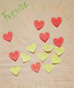Seither steht bei mir der Wunsch, die Veränderung, das Tun aus dem Herzen noch mehr im Mittelpunkt. Das, was sich die Teilnehmer_innen an diesem Tag mitgenommen und mir als Feedback hinterlassen haben, steht auf den roten und gelben Herzen. So kann sich jede an ihren Herzensmoment vom Workshop erinnern und für mich ist dieses Bild, wie Balsam auf der Seele.