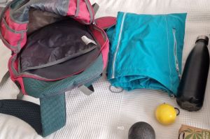 Am Foto siehst du, wie ich meinen Rucksack, speziell mit Tape und Faszienball, für Martina bestückt habe, weil ich sie auf einem Teilstück begleiten und falls nötig die Muskeln versorgen wollte. Leider wurde auch dieses Projekt kurzfristig aufrund eines wichtigen Meetings meines Mannes gecancelt.